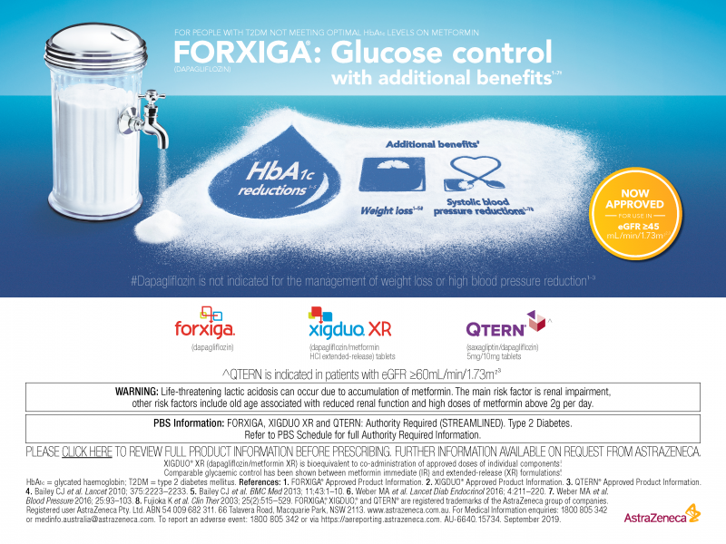 FORXIGA®, XIGDUO®, and QTERN® are registered trademarks of the AstraZeneca group of companies. Registered user AstraZeneca Pty. Ltd. ABN 54 009 682 311. 66 Talavera Road, Macquarie Park, NSW 2113. www.astrazeneca.com.au. For Medical Information enquiries: 1800 805 342 or medinfo.australia@astrazeneca.com. To report an adverse event: 1800 805 342 or via https://aereporting.astrazeneca.com.